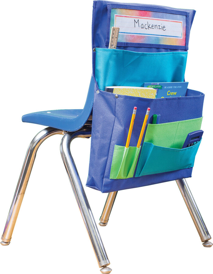 Clear pocket holds a name plate up to 3 1/2 x 11 1/2 inches. Large pockets are ideal for workbooks, folders, etc., and small pockets are ideal for supplies. Made with durable canvas. Metal rivets provide extra strength at stress points. Easily slides over the back of a chair up to 13 inches wide, 5 inches from top.