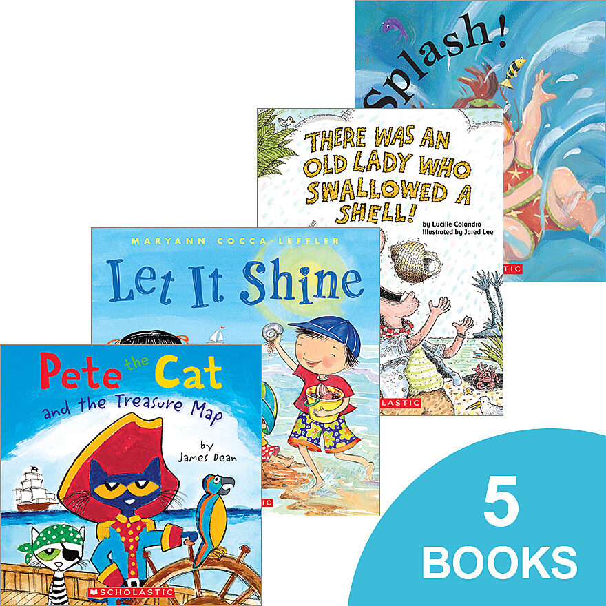 Celebrate summer with this five book value pack. Pack includes There Was an Old Lady Who Swallowed a Shell, Pete the Cat and the Treasure Map, Let It Shine, Penguin on Vacation, and Splash!